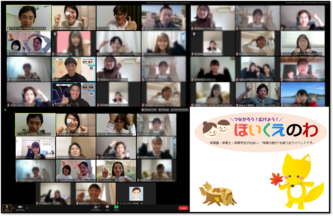 保育園さまによるプレゼンテーションでは保育の様子、いい保育士やいい保育に対する考え、今後の展望をお話いただきました。その後はブレイクアウトルームに分かれ、じっくり交流タイム。